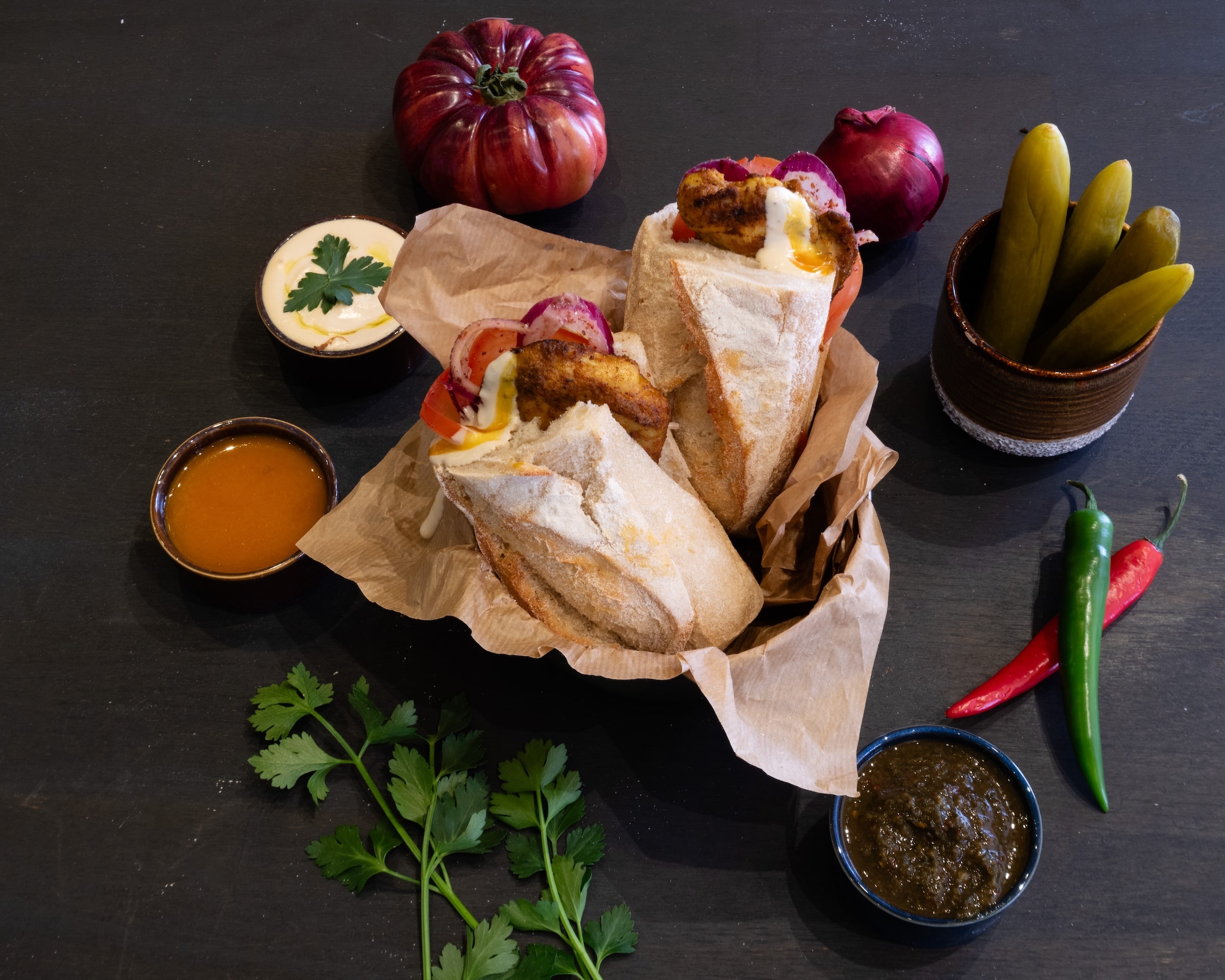 Grilled chicken, signature aioli, fresh lettuce, red onion, salty pickles, tomato