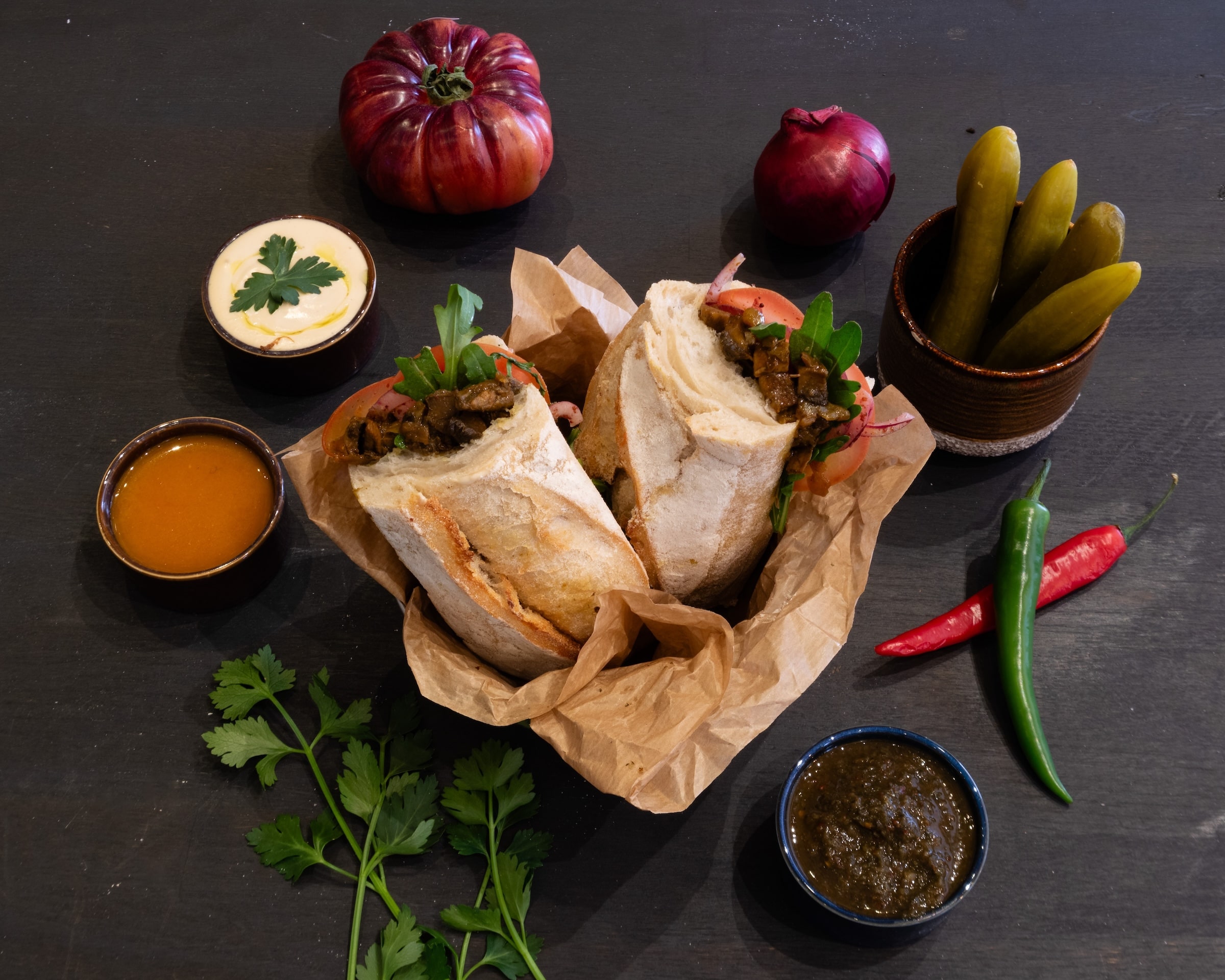 Fluffy pita, slow-cooked mushrooms, tahini, amba paste, sumac onion, tomato, fresh arugula